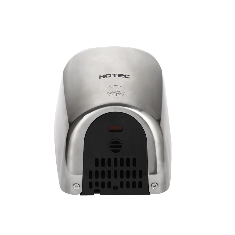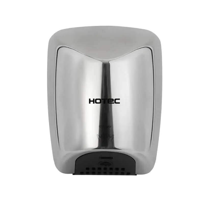 HOTEC touchless hand free hand dryer, one-piece cover body, durable and antirust. Made of 304 stainless steel with silver bright finish. Easy installation and maintenance. High speed brush motor incorporating a safety  thermal cut-off.
