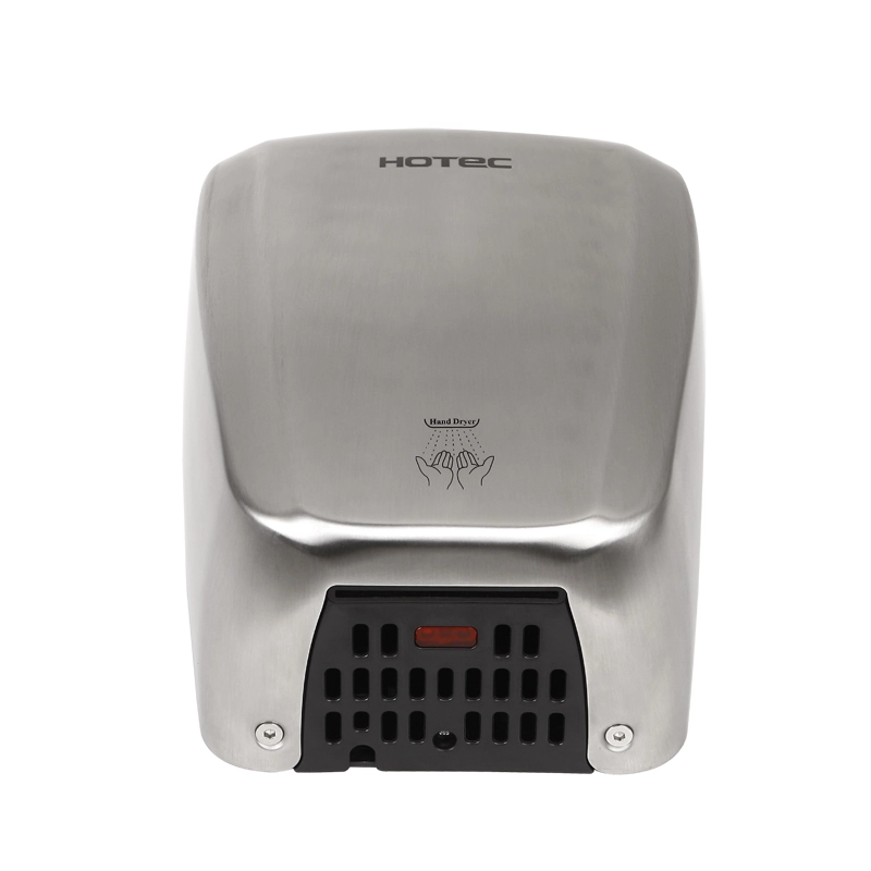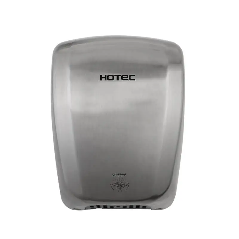 Automatic HOTEC hand dryer, one-piece cover body, durability vandalism proof.  Made of stainless steel, satin finish for long lasting use. Easy installation and maintenance. High speed brush motor incorporating a safety  thermal cut-off.