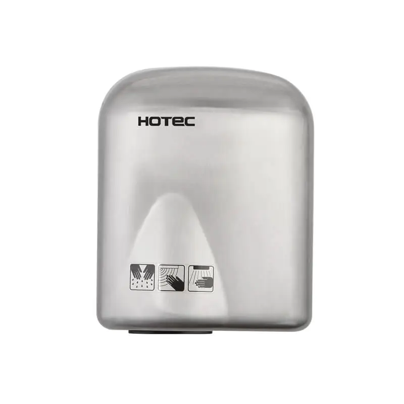 HOTEC touchless hand dryer made of 304 stainless steel with satin finish. Easy to install and maintenance. It is one-piece cover, durability and antirusting including a safety thermal cut-off. High speed brush motor, drying fast.